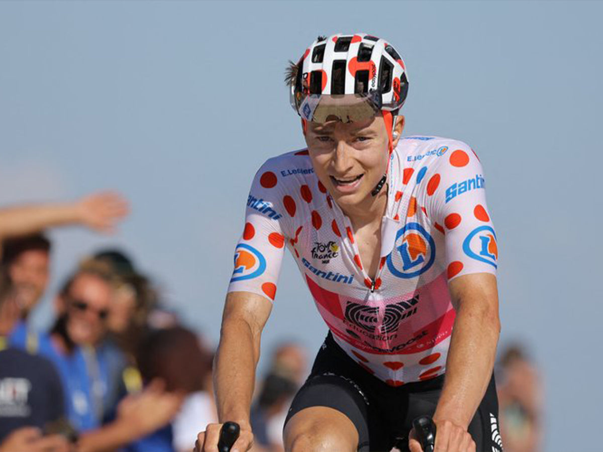. Le Maillot à pois, il est porté par le coureur en tête du classement du meilleur grimpeur. Les «points montagne» sont attribués aux sommets des cols et varient selon la catégorie de celui-ci.