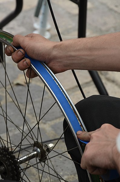 - enrouler bien à plat le nouveau fond de jante en commençant par le trou pour la valve