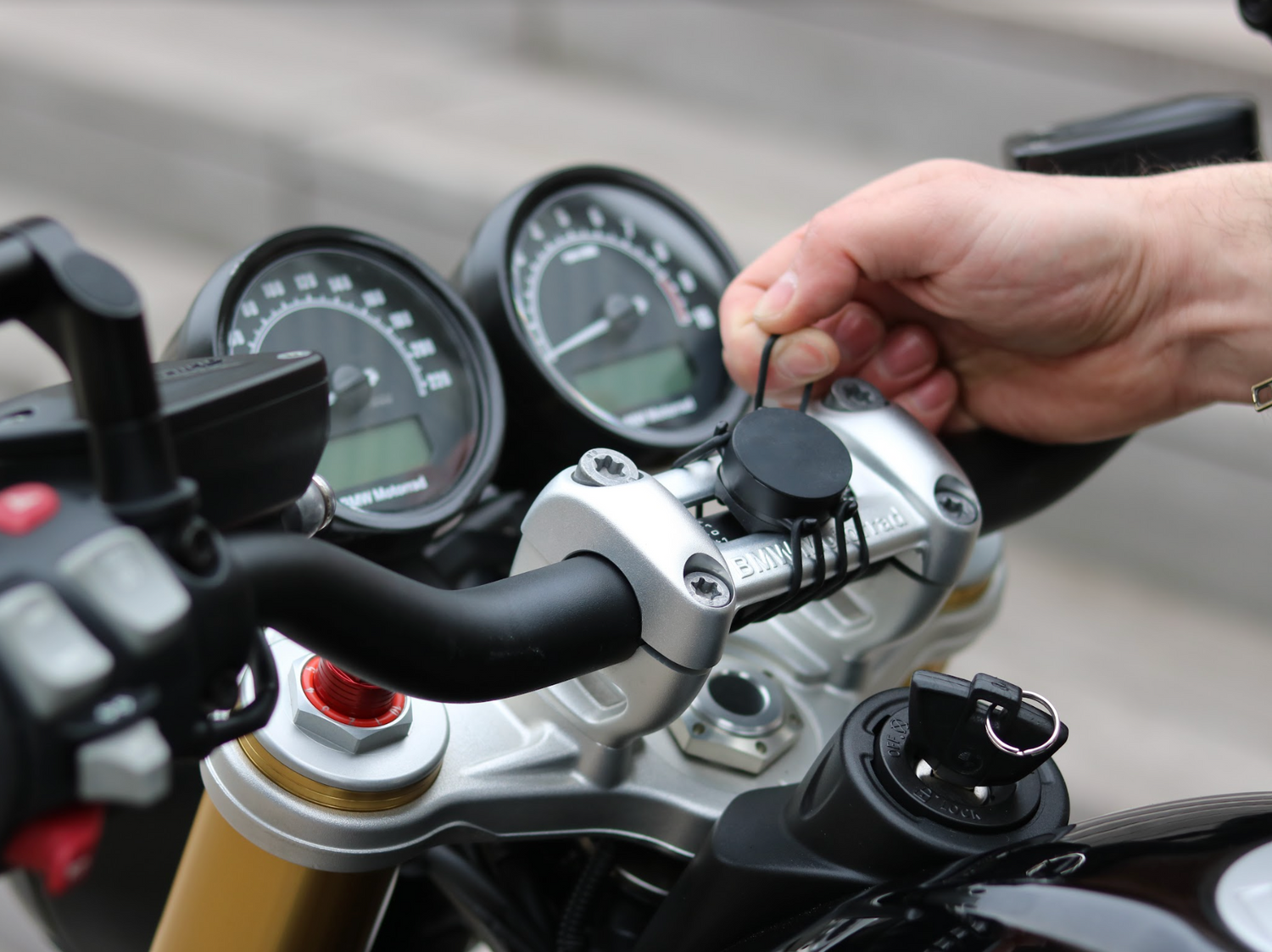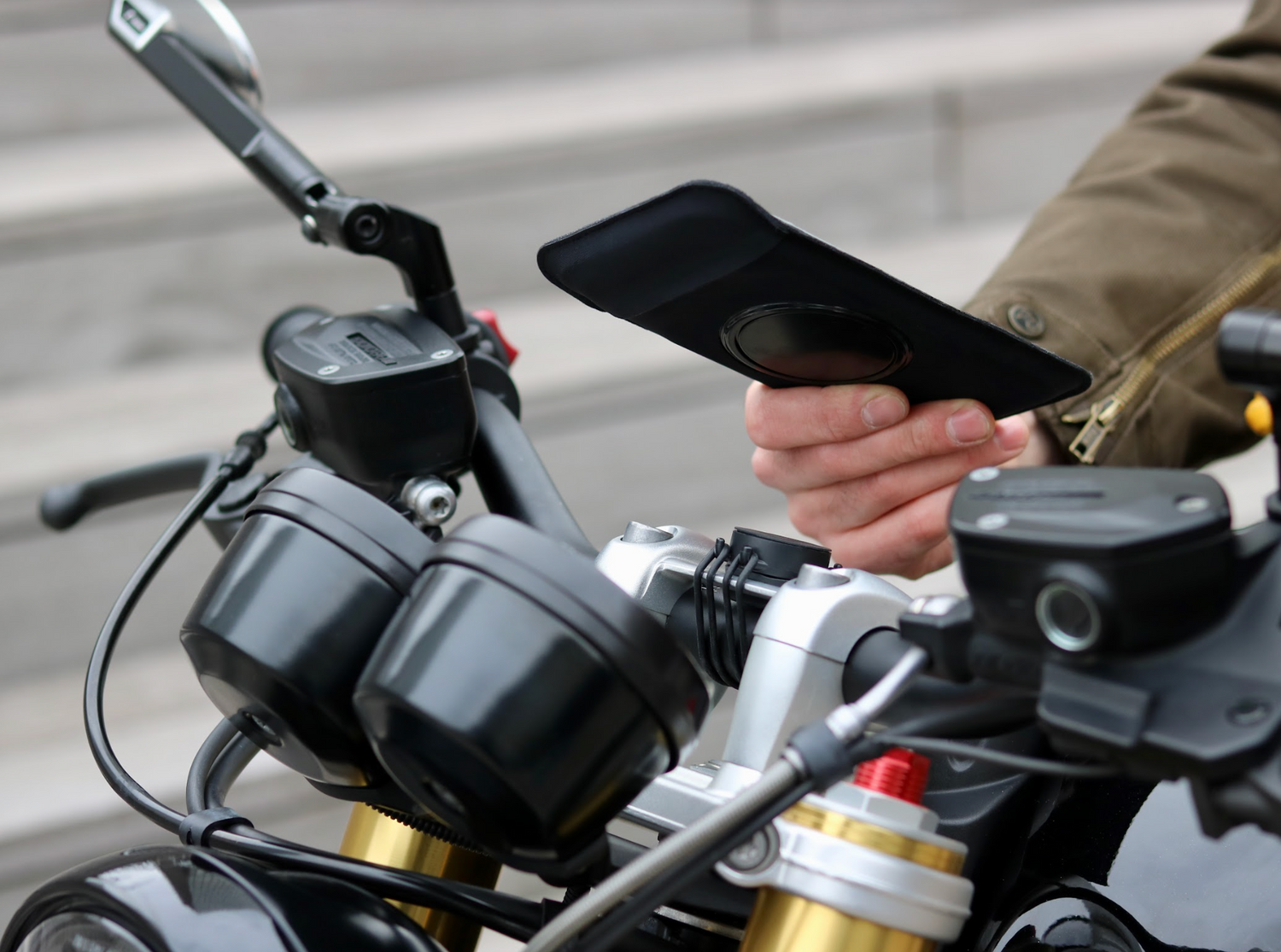 Installez le support Moto Classique en quelques secondes, grâce aux élastiques ou au strap (les deux sont fournis), directement sur votre guidon de 20 à 50 mm de diamètre. Puis, glissez votre téléphone dans la pochette et aimantez l’ensemble au support.