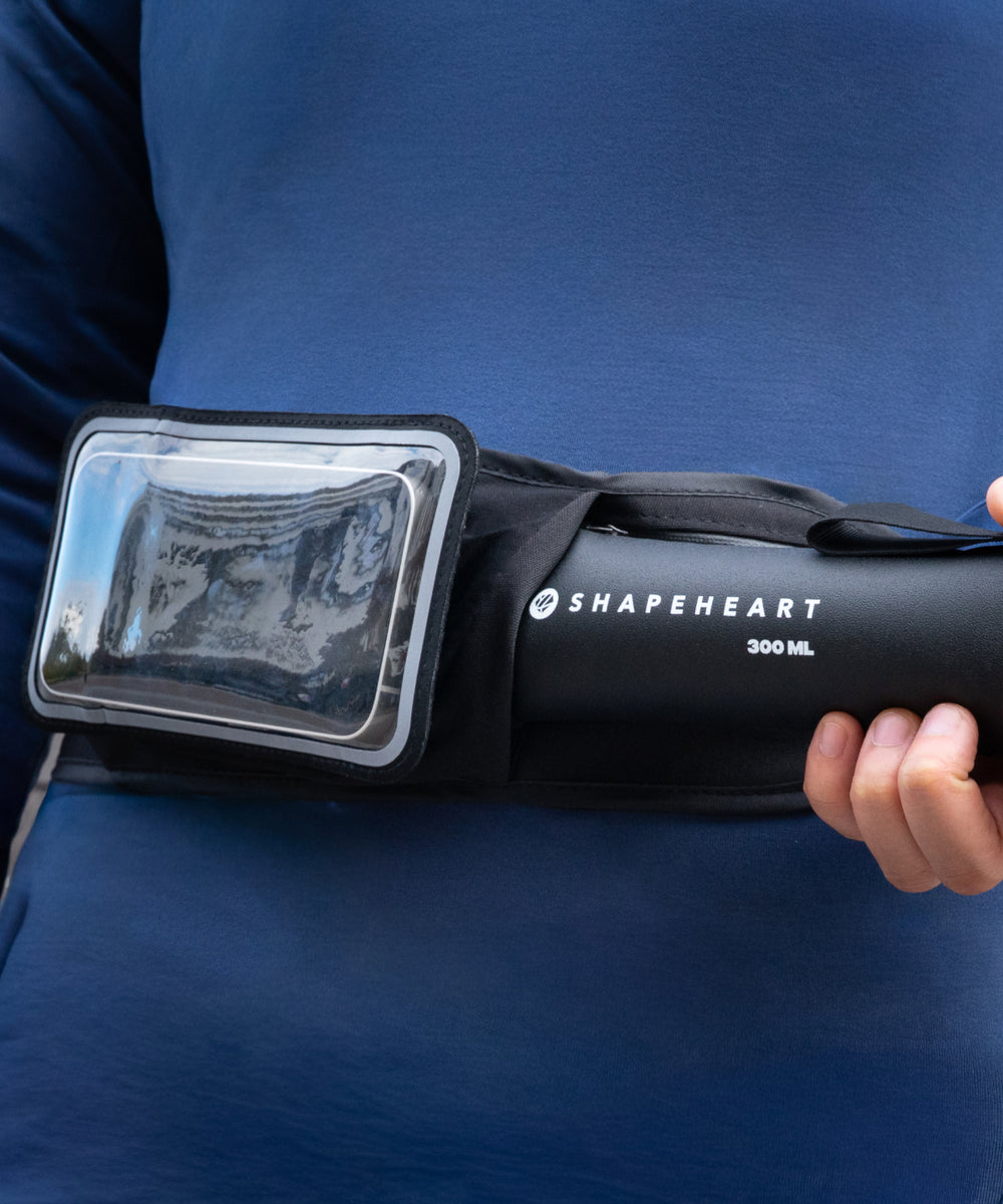 Compatible avec notre ceinture magnétique, placez la gourde souple Shapeheart au niveau de la poche centrale sous votre téléphone.